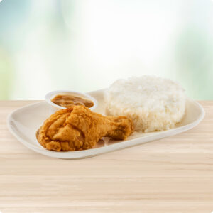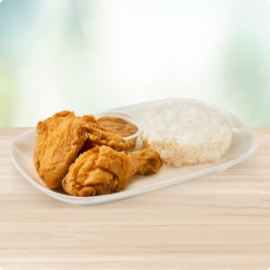 A 1 piece of perfectly battered and crispy golden-brown fried chicken, served with rice and signature brown gravy. Comes with your choice of a regular drink (12 oz Soft Drink, Iced Tea, Iced Coffee) or bottled water. Upgrade your drink to a refreshing Go Shake—Mango, Ube, or Chocolate!