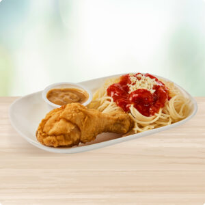 A 1 piece of crispy, golden-brown battered fried chicken with signature gravy, served with classic sweet, meaty, and cheesy spaghetti.